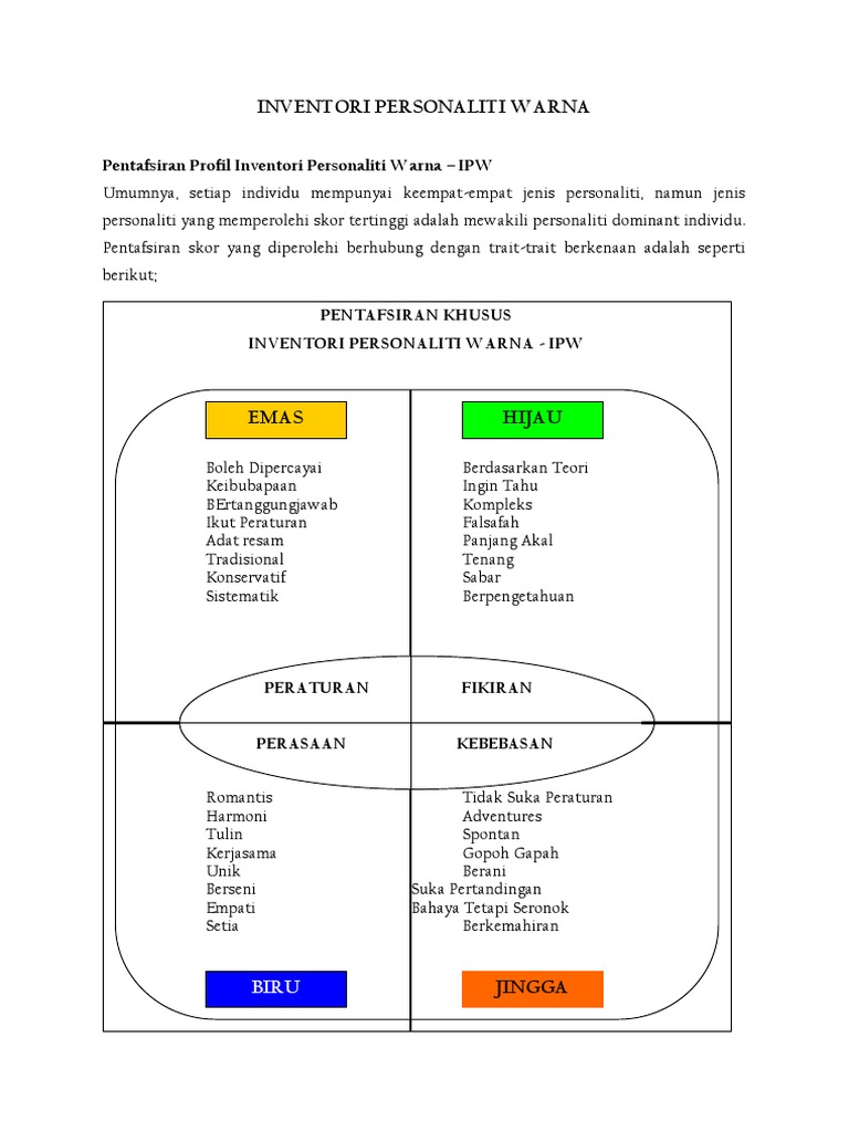 59369126 Interpretasi Ipw from reader020.staticloud.net Hyphens or spaces usually separate the elements of the number on the item. Inventori personaliti warna (inventori personaliti warna01 pengenalan inventori personali.) pengenalan inventori personaliti warna (ipw). • mengandungi 100 item (format 'ya' atau 'tidak') • respons individu : Identitas suatu warna ditentukan panjang gelombang cahaya tersebut. Nak tahu x personaliti berdasarkan warna??meh try jawab kuiz ni.hehehe.selamat menjawab ^_^ inventori warna. · cari selisih antara grafik dasar (warna biru/ hitam untuk dewasa) dengan grafik namun dalam pekembangannya telah berubah menjadi tes bakat, dengan cara merubah tekanan skoring dan interpretasi. Interpretasi inventori personaliti sidek (ips) personaliti sebagai organisasi sistem psikologikal yang dinamik di dalam jiwa individu. It allows them to learn which.