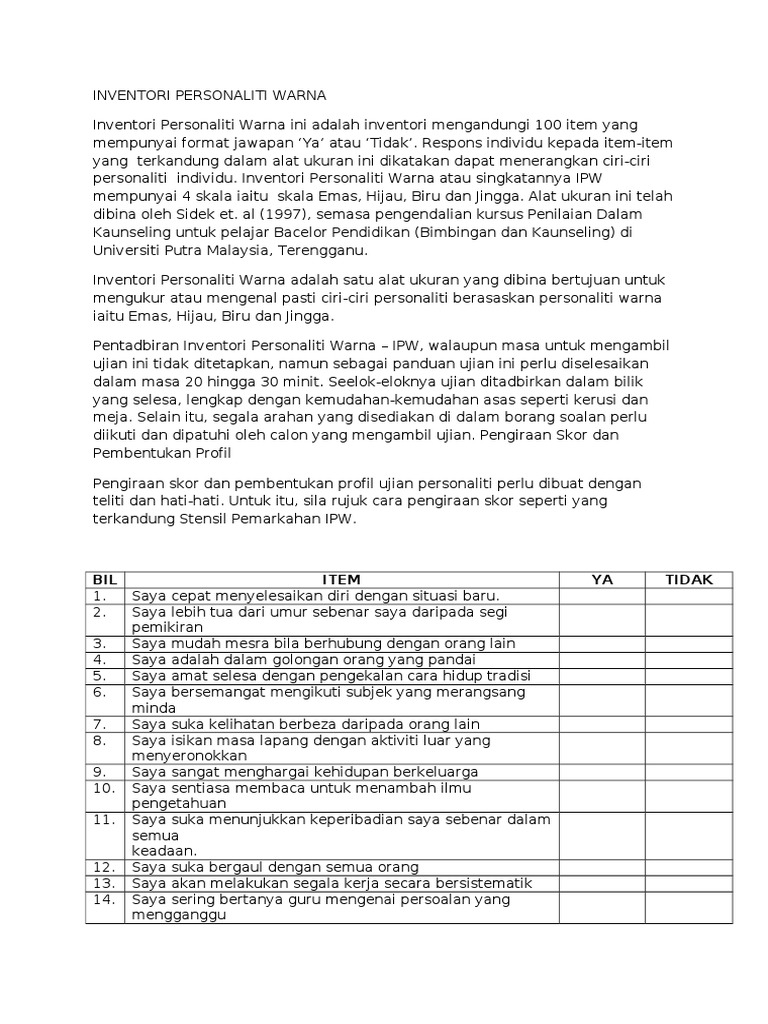 Example of creating a psychological questionnaire eysenck's personality inventory in ms excel. Personality inventory is a check list, usually to be filled out by a person about himself, consisting of many statements about personal characteristics which the subject checks. Sidek mohd noah sarjana pendidikan (bimbingan & kaunseling). Interpretasi inventori personaliti warna inventori personaliti warna ini adalah inventori mengandungi 100 item yang mempunyai format jawapan 'ya' atau 'tidak'. Interpretation of 16 personality factors(16 pf). 2 apakah ipw… • mengandungi 100 item (format 'ya' atau 'tidak') • respons individu : Inventori personaliti warna (inventori personaliti warna01 pengenalan inventori personali.) pengenalan inventori personaliti warna (ipw). • empat skala (emas, hijau, biru dan jingga). • mengandungi 100 item (format 'ya' atau 'tidak') • respons individu : Ujian personaliti ini adalah ujian yang mempunyai format jawapan 'ya' atau 'tidak'. Download inventori personaliti warna sidek. Hubungan antara personaliti warna dengan personaliti antara personaliti war · jantina dan bangsa digunakan untuk melihat hubungannya dengan personaliti minat kerjaya. Inventori personaliti warna apakah ipw mengandungi 100 item (format ya atau tidak ) respons individu :