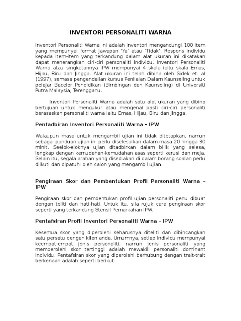 Interpretasi Ipw from imgv2-1-f.scribdassets.com Download inventori personaliti warna sidek. Inventori personaliti warna ini adalah inventori mengandungi 100 item yang mempunyai format jawapan 'ya' atau 'tidak'. ● mengandungi 100 item yang mempunyai format 'ya' atau 'tidak'. Sidek mohd noah sarjana pendidikan (bimbingan & kaunseling). Interpretasi inventori personaliti warna inventori personaliti warna ini adalah inventori mengandungi 100 item yang mempunyai format jawapan 'ya' atau 'tidak'. This guide will empower you to get the score you want. Hyphens or spaces usually separate the elements of the number on the item. Libraries add bibliographic records to worldcat representing books and other items in their collections.